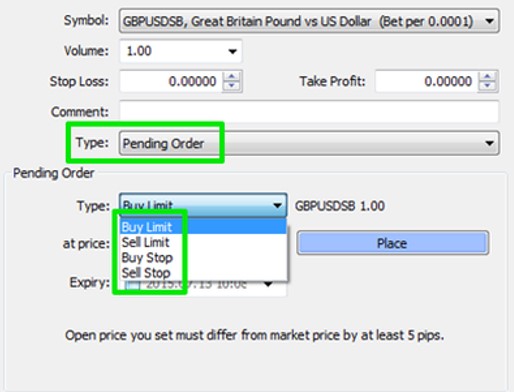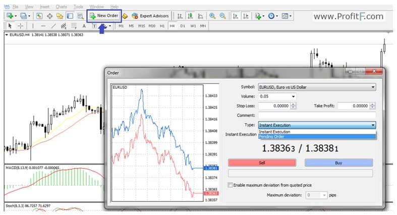 Bước 1: Sau khi phân tích biểu đồ trên MT4, nhấn phím “F9” hoặc click chọn mục “New Order” (thêm lệnh mới) trên thanh công cụ để mở hộp thoại đặt lệnh. Trong mục “Type” (Phân loại), bạn hãy chọn “Pending Order” (Lệnh chờ).