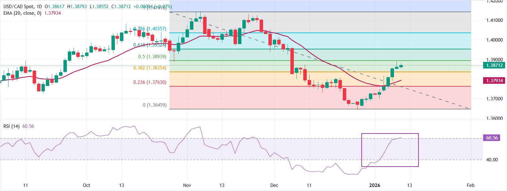 Tỷ giá USD/CAD tiếp tục đà tăng kéo dài hai tuần, đạt gần mức 1.3871 vào thứ Sáu, trước thềm công bố dữ liệu việc làm phi nông nghiệp (NFP) của Mỹ . Đường trung bình động lũy thừa 20 ngày (EMA) đã vượt lên mức 1.3793 và cặp tỷ giá này giữ vững trên mức đó, duy trì xu hướng tăng giá trong ngắn hạn.