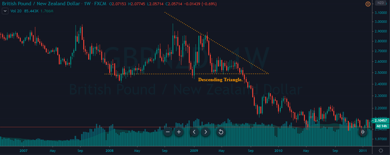 Khi vẽ 2 đường xu hướng đi qua các đỉnh và đáy của các sóng Elliott sẽ tạo thành mô hình tam giác. Mô hình này được chia thành 2 dạng: