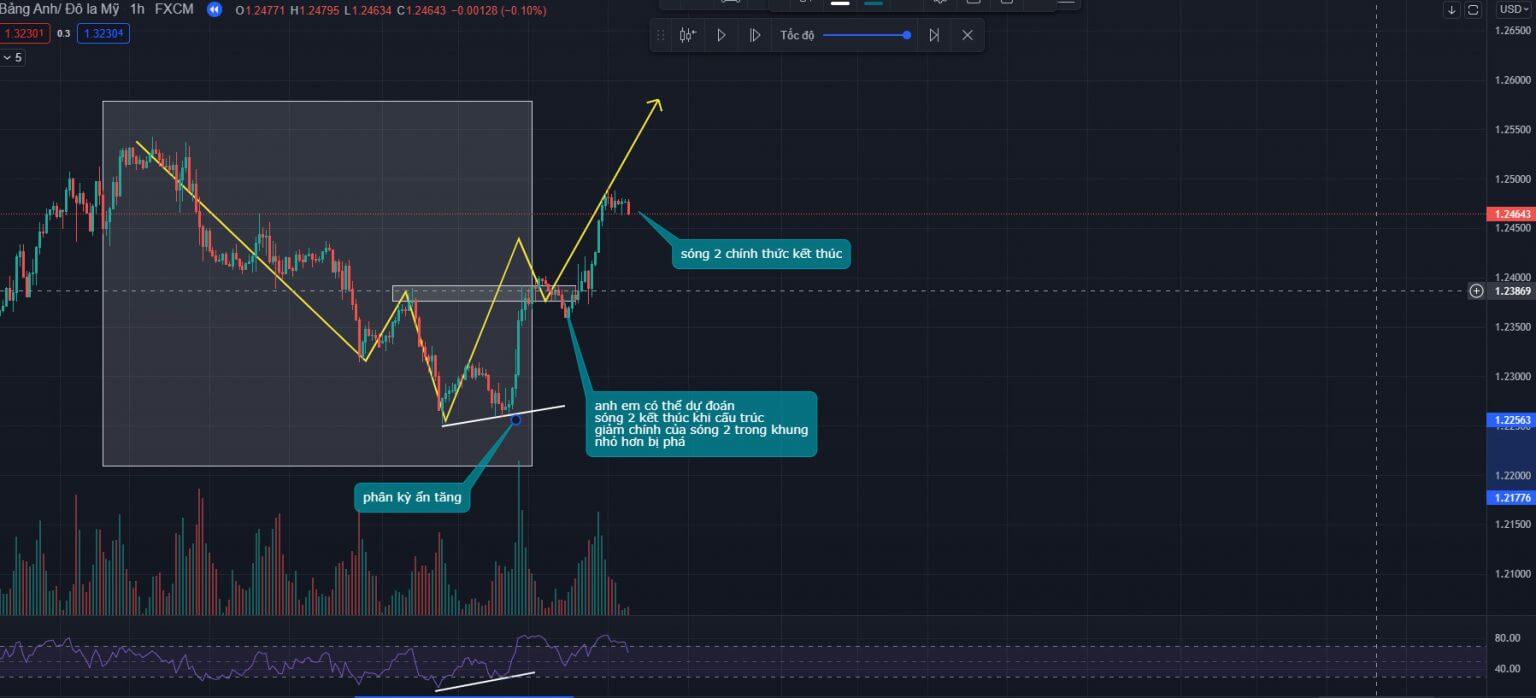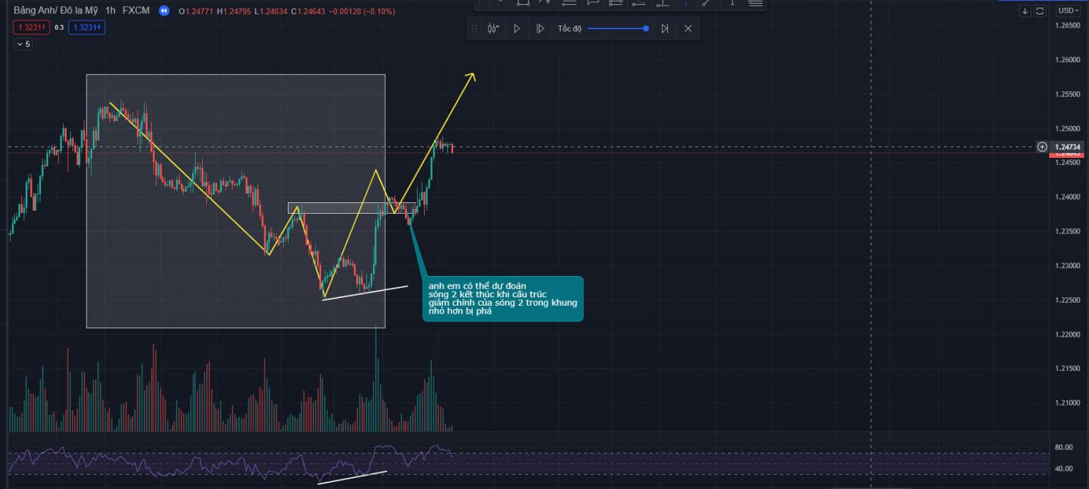 Tiếp tục phân tích ở hình trên đây, bạn sẽ thấy được cấu trúc của đợt sóng có giảm ở khung thời gian H1 chính thức bị phá theo lý thuyết Dow kết hợp chỉ báo RSI. Lúc này, đợt sóng tạo ra quá bán và phân kỳ, là cơ sở dự đoán được sóng 2 đã kết thúc.