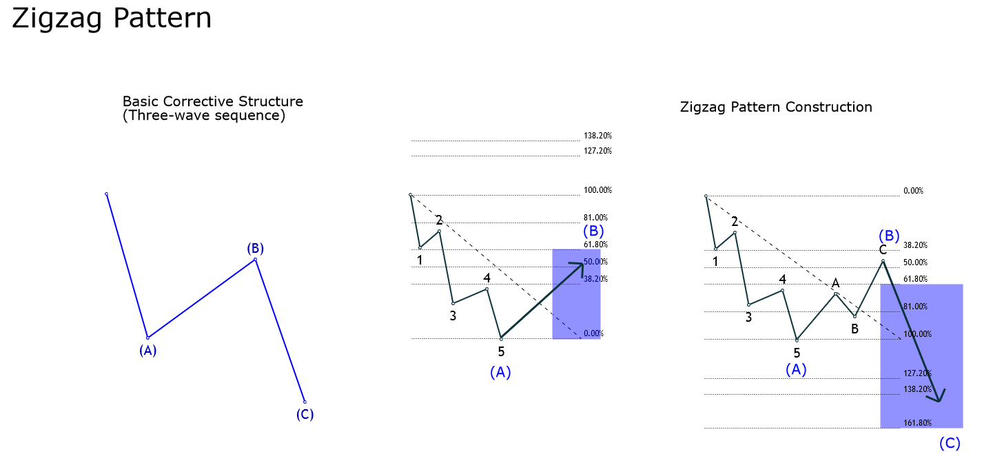 - Mô hình Zigzag: 2 đường xu hướng của mô hình Zigzag đi qua đỉnh và đáy của các bước sóng song song với nhau. Trong đó, sóng B ngắn nhất, sóng A và sóng C sẽ dài hơn và có xu hướng bằng nhau.