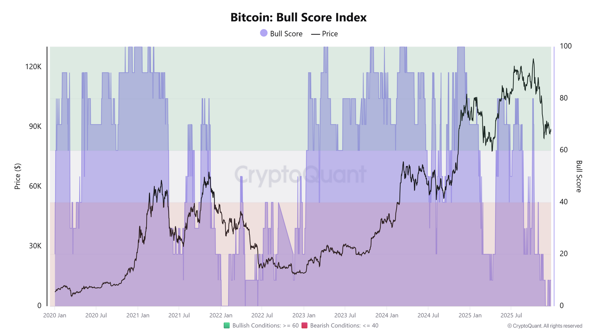 “Sự suy giảm nghiêm trọng đến mức gần như mọi chỉ báo kỹ thuật và on-chain quan trọng hiện đều báo hiệu thị trường đã bước vào giai đoạn giảm giá, như đã thấy trong Chỉ số Bull Score của CryptoQuant giảm xuống 0 (mức giảm mạnh nhất) lần đầu tiên kể từ tháng 1 năm 2022, khi thị trường gấu trước đó bắt đầu”, nhà phân tích của CryptoQuant cho biết.
