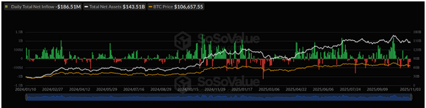 Bitcoin đã giảm do nhu cầu của các tổ chức giảm đáng kể trong tuần qua. Các quỹ ETF BTC đã ghi nhận dòng tiền rút ròng 187 triệu đô la vào thứ Hai, đánh dấu ngày thứ tư liên tiếp dòng tiền rút ra. Các quỹ ETF BTC đã chứng kiến dòng tiền rút ra 1,67 tỷ đô la kể từ ngày 11 tháng 10. Những dòng tiền rút ra này cho thấy nhu cầu đầu tư BTC của các tổ chức thông qua các quỹ ETF đã suy yếu sau một thời gian mua mạnh vào đầu năm. Các quỹ ETF BTC là một yếu tố quan trọng góp phần vào đà tăng giá của BTC lên mức cao kỷ lục 126,2 nghìn đô la. Do đó, việc dòng tiền rút ra liên tục cũng đẩy nhanh xu hướng giảm giá là điều dễ hiểu.