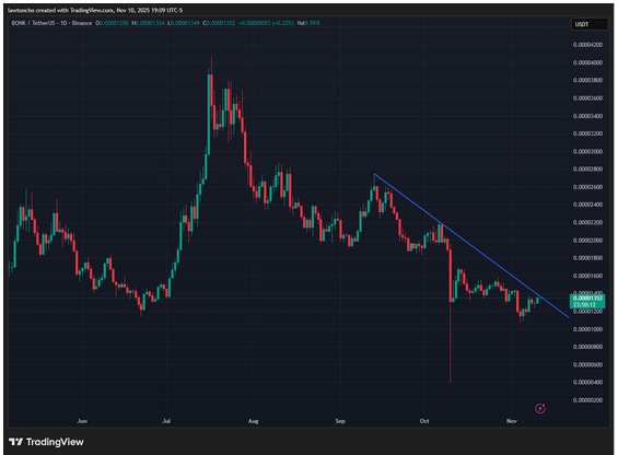 Khi tôi xem xét kỹ hơn về thiết lập hiện tại của BONK Coin, thật khó để không nhận ra điều gì có thể đang hình thành nên một cơ hội bứt phá mạnh mẽ. BONK đã trải qua một đợt điều chỉnh mạnh, giảm hơn 66% so với mức đỉnh hồi đầu năm nay. Mặc dù kiểu suy giảm này thường khiến những nhà đầu tư yếu thế bị loại bỏ, nhưng nó cũng tạo ra tiềm năng cho đà tăng mới nếu các yếu tố kỹ thuật phù hợp. Hiện tại, BONK đang tiến gần đến một ngưỡng quan trọng một đường xu hướng dốc xuống nối liền mức đỉnh từ ngày 13 tháng 9 đến mức đỉnh trong tháng 10, kéo dài đến vị trí hiện tại.