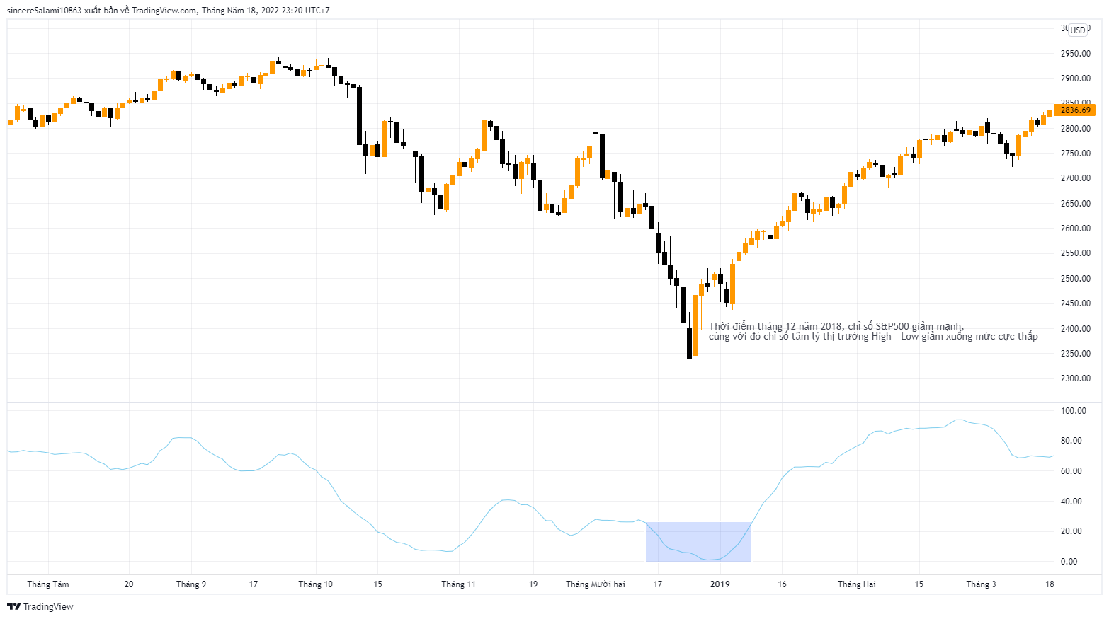 Kết quả, thị trường chứng khoán Mỹ đã có tháng 12 tồi tệ nhất kể từ năm 1931, chỉ số S&P500 giảm 9,2% trong tháng, chỉ số công nghiệp Dow Jones giảm 8,7% so với cùng kỳ. Chỉ số High – Low của S&P500 cũng giảm xuốn g dưới 30 và duy trì ở mức gần 0, cho thấy mức độ tâm lý giảm giá đang bao trùm thị trường tại thời điểm đó (High – Low là một chỉ báo tâm lý thị trường – mức dưới 30 là tâm lý giảm giá).