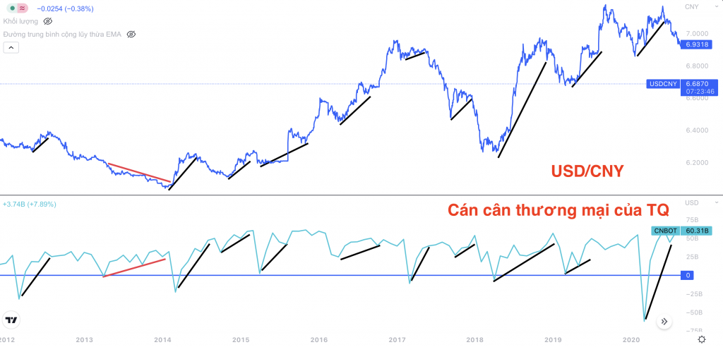 Như bạn có thể thấy mỗi lần thâm hụt thương mại hoặc cán cân thương mại giảm sâu thì cặp tỷ giá USD/CNY lại tăng (Trung Quốc hạ giá CNY so với USD), và sau mỗi lần như vậy thì cán cân thương mại lại thặng dư thêm. Tuy nhiên vẫn có một vài lần quy luật này không hoạt động (gạch đỏ), đây chính là lý do bạn cần phải quản lý vốn chặt chẽ.