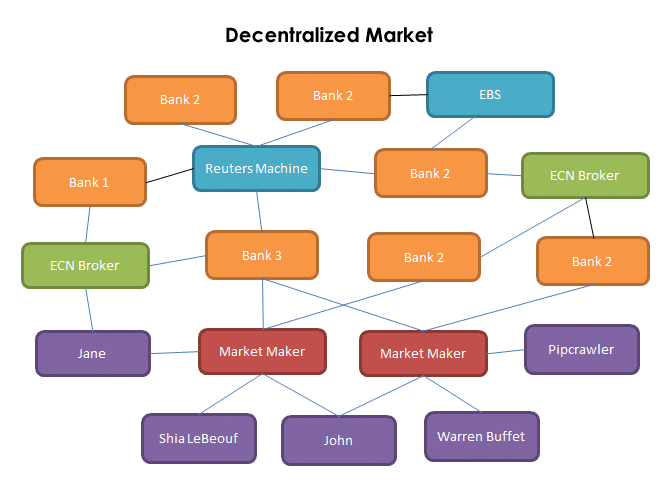 Cấu trúc thị trường forex mang đặc tính phi tập trung (decentralized), các thành phần tham gia thị trường chung này có mặt ở khắp nơi trên thế giới và hoàn toàn không bị chi phối bởi các hạn chế như phía trên.