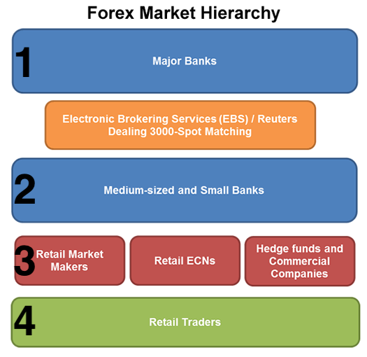 (1) và (2) Trên cùng là thị trường liên ngân hàng, các ngân hàng trong nhóm này giao dịch với nhau bằng các môi giới riêng của mình hoặc thông qua mạng lưới Reuter matching hay Refinitiv (EBS trước đây). Nhóm các ngân hàng này có các giao dịch rộng khắp toàn cầu, các giao dịch của họ nhằm đáp ứng các nhu cầu ký quỹ hay hỗ trợ nhau lúc khó khăn, đầu tư hoặc đầu cơ,… Đây là nhóm sẽ nhận được mức giá tốt nhất trên thị trường.