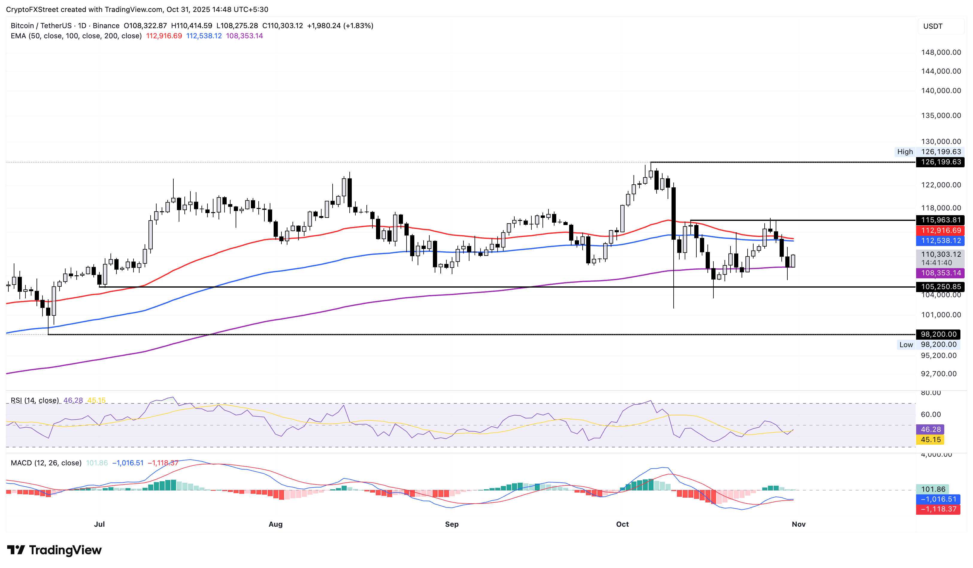Bitcoin (BTC) và các altcoin lớn đã phục hồi vào thứ Sáu, cố gắng tìm lại đà tăng sau bốn ngày giảm liên tiếp. BTC phục hồi trên 110.000 đô la, bật lên từ đường trung bình động hàm mũ (EMA) 200 ngày, trong khi Ethereum (ETH) và Ripple (XRP) cũng bắt chước đà phục hồi trong ngày của Bitcoin, sau khi các yếu tố thúc đẩy như việc cắt giảm lãi suất của Cục Dự trữ Liên bang vào thứ Tư và cuộc họp giữa Trump và Tập Cận Bình vào thứ Năm đã không thể cải thiện tâm lý thị trường.