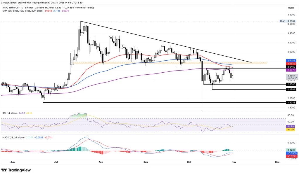 Nhìn xuống, các mức hỗ trợ chính cho XRP là 2,30 đô la và 2,19 đô la, lần lượt được đánh dấu bằng mức thấp nhất vào ngày 11 tháng 10 và ngày 17 tháng 10.