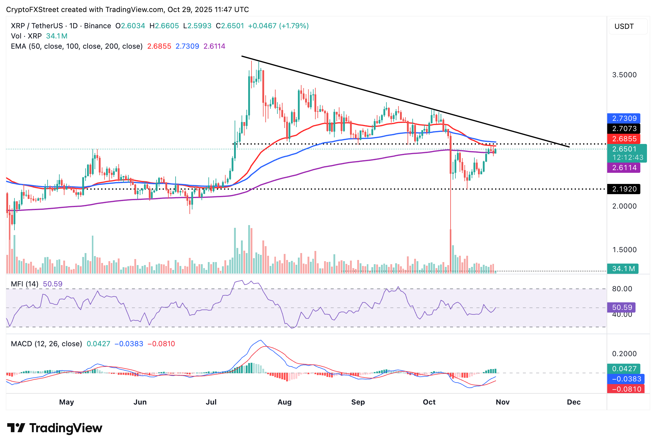 Đối với XRP, giá đang dao động giữa mức hỗ trợ EMA 200 ngày là 2,61 đô la và mức kháng cự EMA 50 ngày là 2,68 đô la. Đường EMA 100 ngày nằm trên mức này một chút ở mức 2,73 đô la.