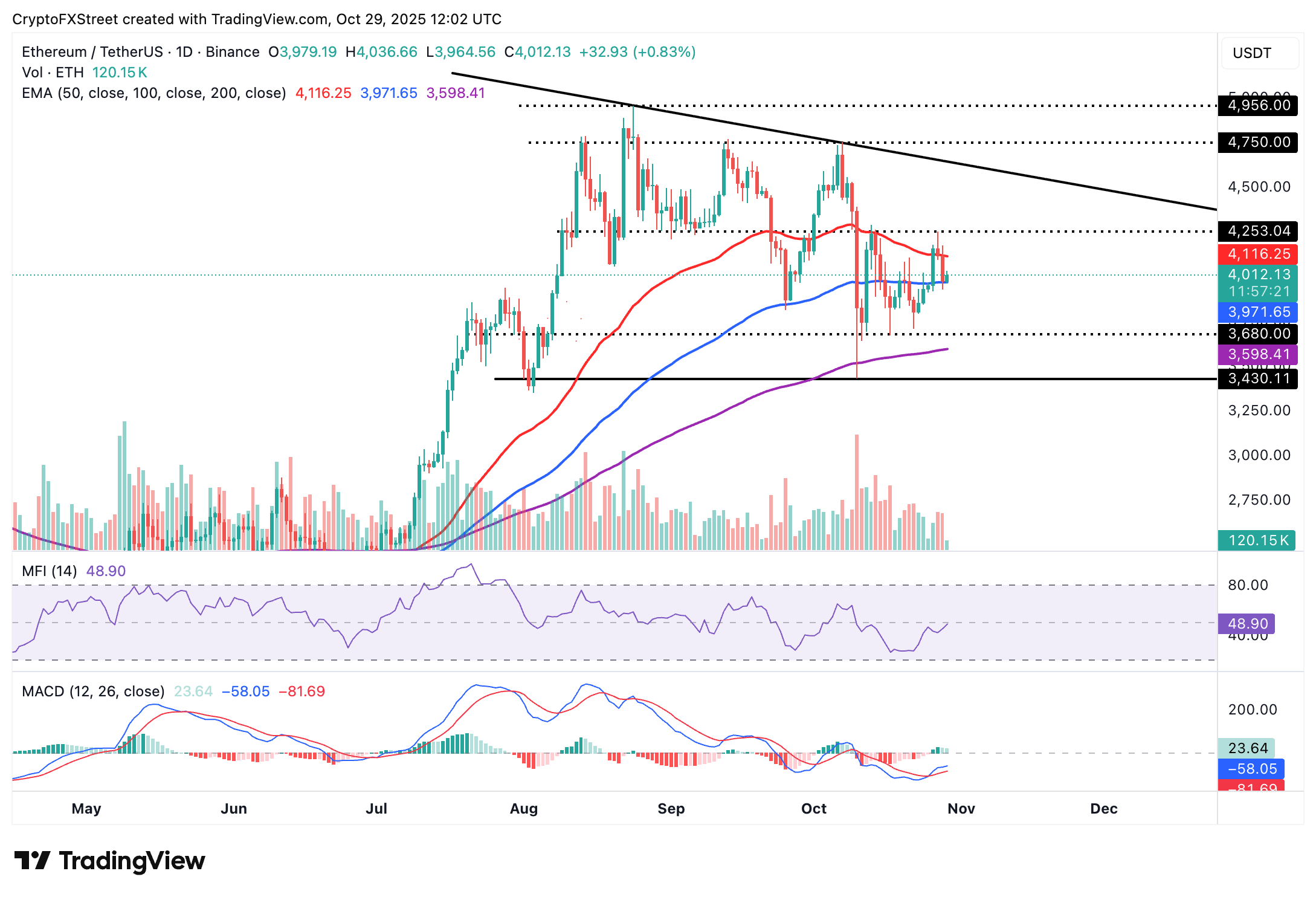 Ethereum vẫn duy trì trên mức 4.000 đô la tại thời điểm viết bài, được hỗ trợ bởi đường EMA 100 ngày ở mức 3.971 đô la trên biểu đồ hàng ngày. Tín hiệu mua từ chỉ báo Phân kỳ Hội tụ Trung bình Động (MACD) kể từ Chủ nhật củng cố tiềm năng phục hồi của Ethereum.