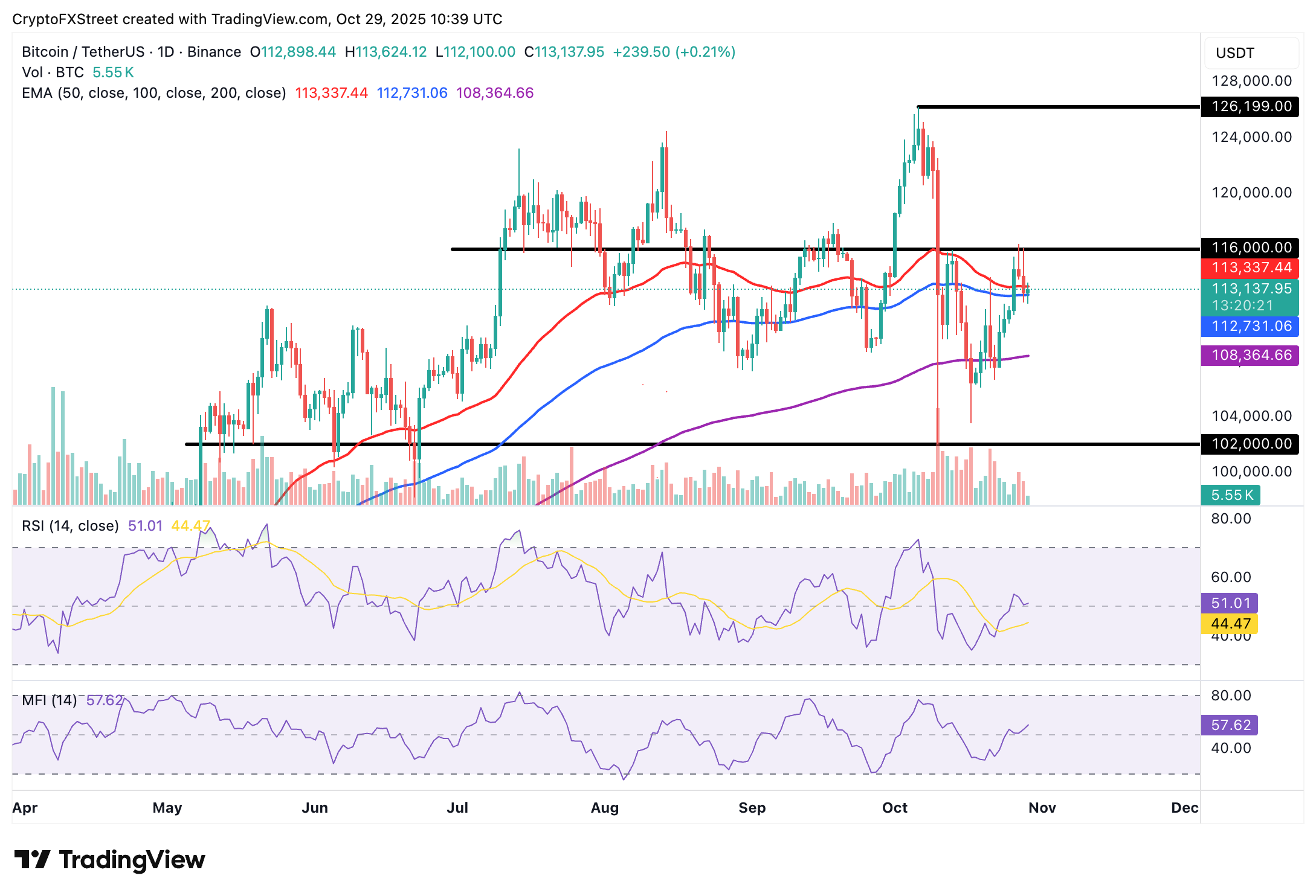 Bitcoin đang giao dịch trên mức 113.000 đô la tại thời điểm viết bài vào thứ Tư, được hỗ trợ bởi đường trung bình động hàm mũ (EMA) 100 ngày ở mức 112.731 đô la. Chỉ số dòng tiền (MFI) trên biểu đồ hàng ngày đã tăng lên 57, cho thấy dòng tiền đang đổ vào Bitcoin nhiều hơn, hỗ trợ tiềm năng tăng giá ngắn hạn.