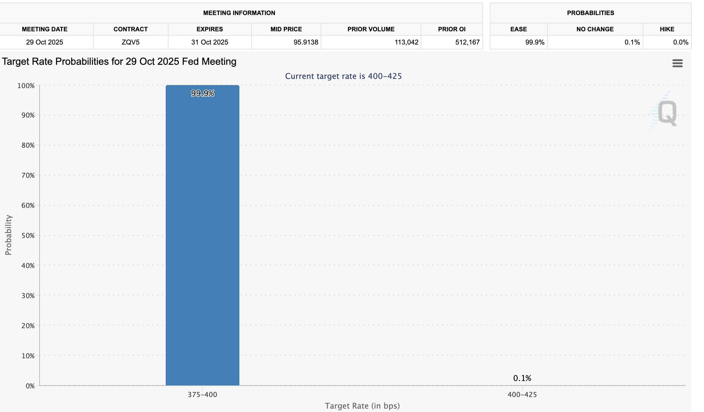 Cuộc họp của Ủy ban Thị trường Mở Liên bang (FOMC) dự kiến sẽ đi đến quyết định về lãi suất. Theo công cụ FedWatch của CME Group, có 99,9% khả năng ngân hàng trung ương sẽ cắt giảm lãi suất 25 điểm cơ bản, đưa lãi suất chuẩn mục tiêu về phạm vi từ 3,75% đến 4,00%.