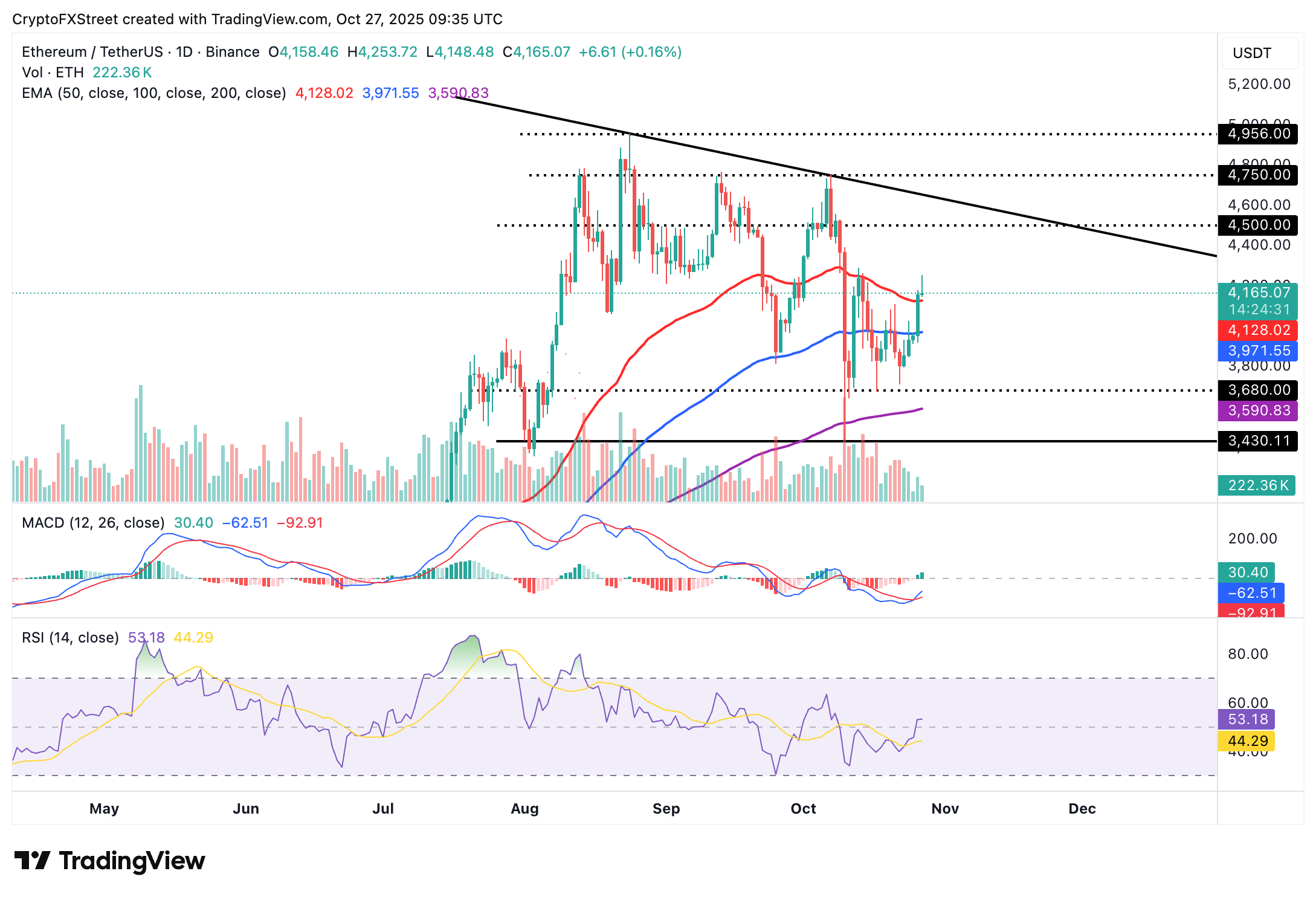 Ethereum phần lớn đang trong xu hướng tăng giá, giữ trên đường hỗ trợ EMA 50 ngày ở mức 4.128 đô la trên biểu đồ hàng ngày. Tín hiệu mua từ chỉ báo MACD, được duy trì từ Chủ nhật, ủng hộ triển vọng tăng giá.