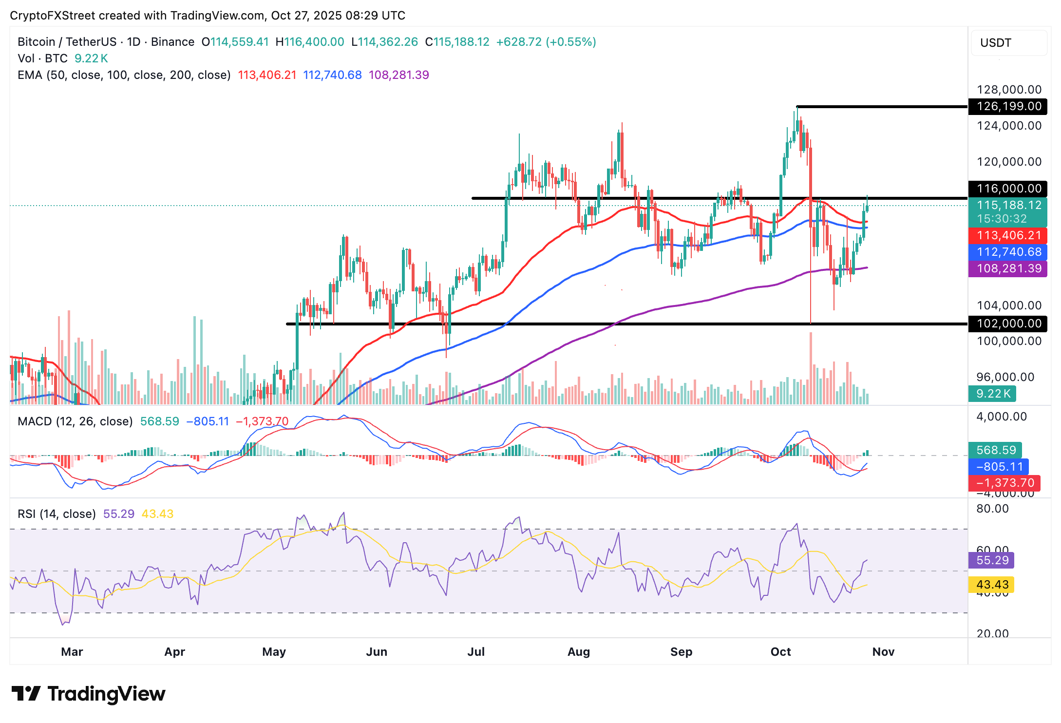 Bitcoin đưa ra tín hiệu tăng giá tại thời điểm viết bài vào thứ Hai sau khi giành lại vị thế trên Đường trung bình động hàm mũ 100 ngày (EMA) ở mức 112.740 đô la và Đường EMA 50 ngày ở mức 113.406 đô la trên biểu đồ hàng ngày.