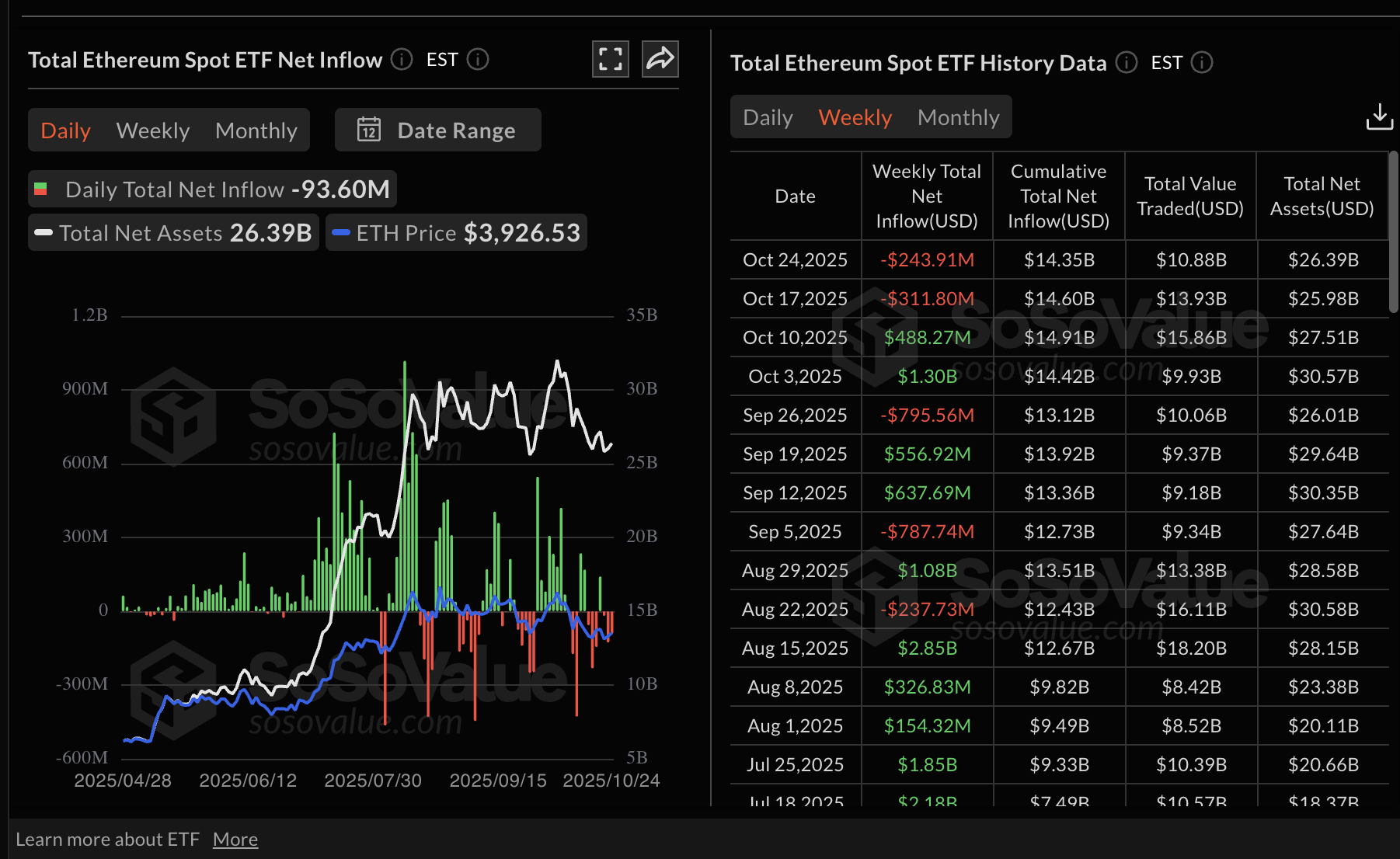 Sự quan tâm đến các ETF Ethereum niêm yết tại Hoa Kỳ thấp hơn Bitcoin, với dòng tiền chảy ra ròng là 244 triệu đô la vào tuần trước và 312 triệu đô la vào tuần trước đó. Theo dữ liệu của SoSoValue, các ETF ETH chỉ chứng kiến dòng tiền chảy vào trong một trong năm ngày làm việc vào tuần trước, cho thấy tâm lý e ngại rủi ro của các nhà đầu tư.