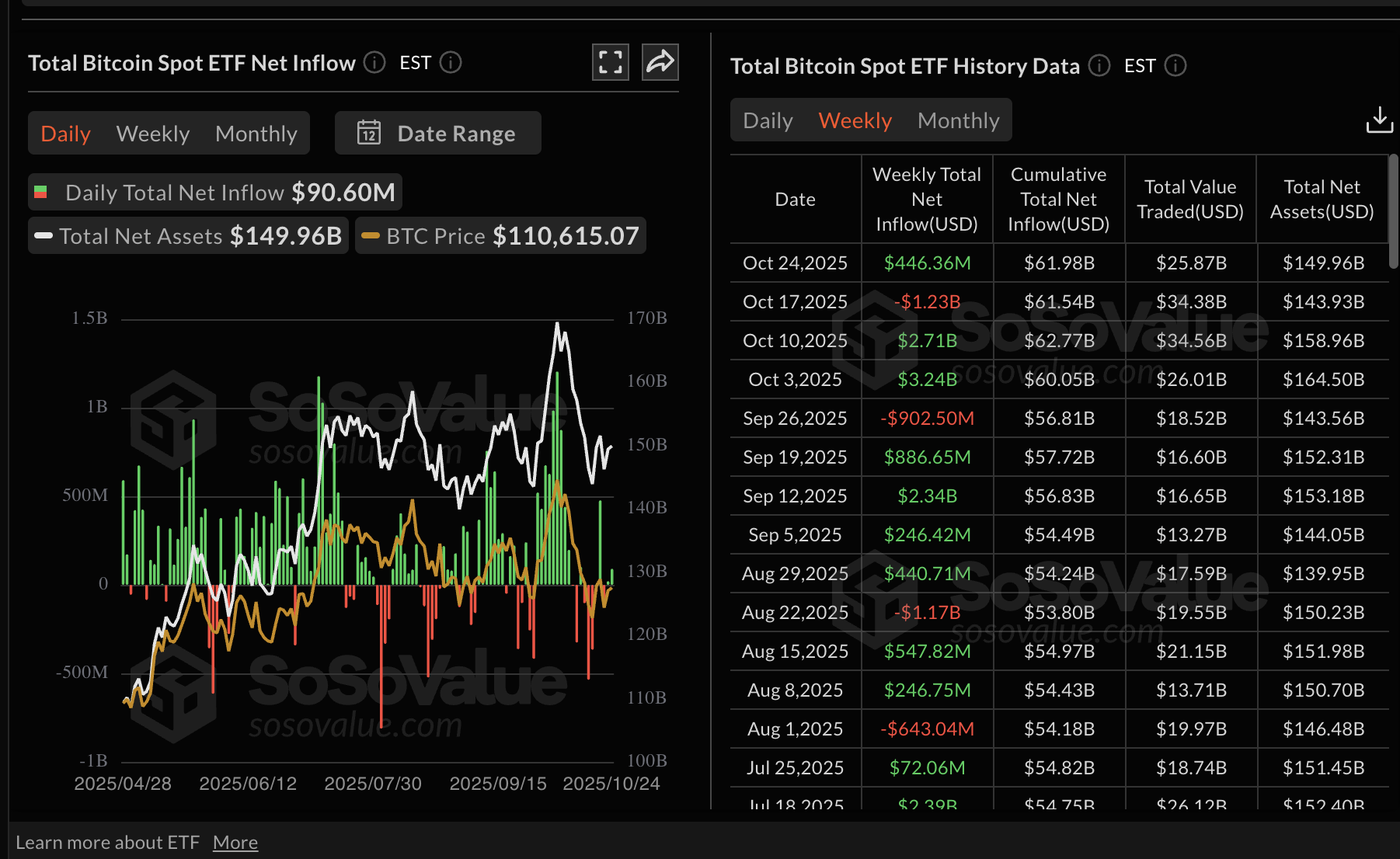 Các quỹ ETF Bitcoin đã ghi nhận khối lượng dòng vốn ròng chảy vào 446 triệu đô la vào tuần trước, đảo ngược xu hướng từ mức dòng vốn chảy ra 1,23 tỷ đô la của tuần trước. Theo dữ liệu của SoSoValue, các quỹ ETF niêm yết tại Hoa Kỳ đã chứng kiến dòng vốn chảy vào ba trong năm ngày trong tuần trước, cho thấy sự quan tâm ngày càng tăng từ các nhà đầu tư tổ chức.