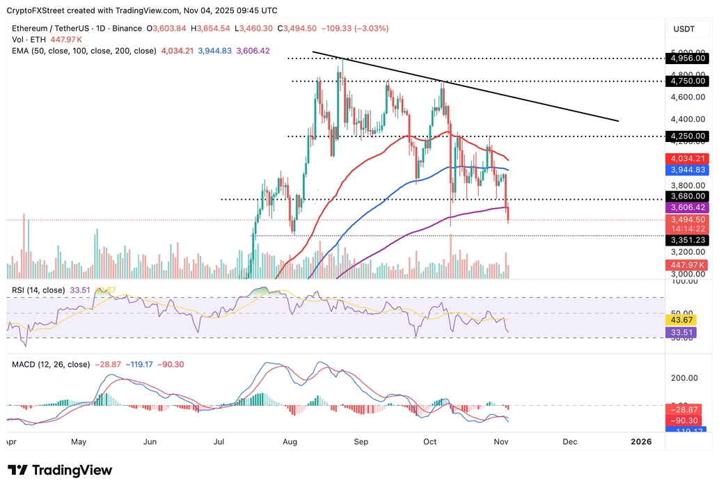 Ethereum đang giao dịch dưới mức 3.500 đô la tại thời điểm viết bài vào thứ Ba, theo sau đà giảm của Bitcoin. Token hợp đồng thông minh này đang nằm dưới các đường trung bình động chính, bao gồm Đường trung bình động hàm mũ (EMA) 200 ngày ở mức 3.606 đô la, EMA 100 ngày ở mức 3.944 đô la và EMA 50 ngày ở mức 4.034 đô la, tất cả đều củng cố tâm lý bi quan.