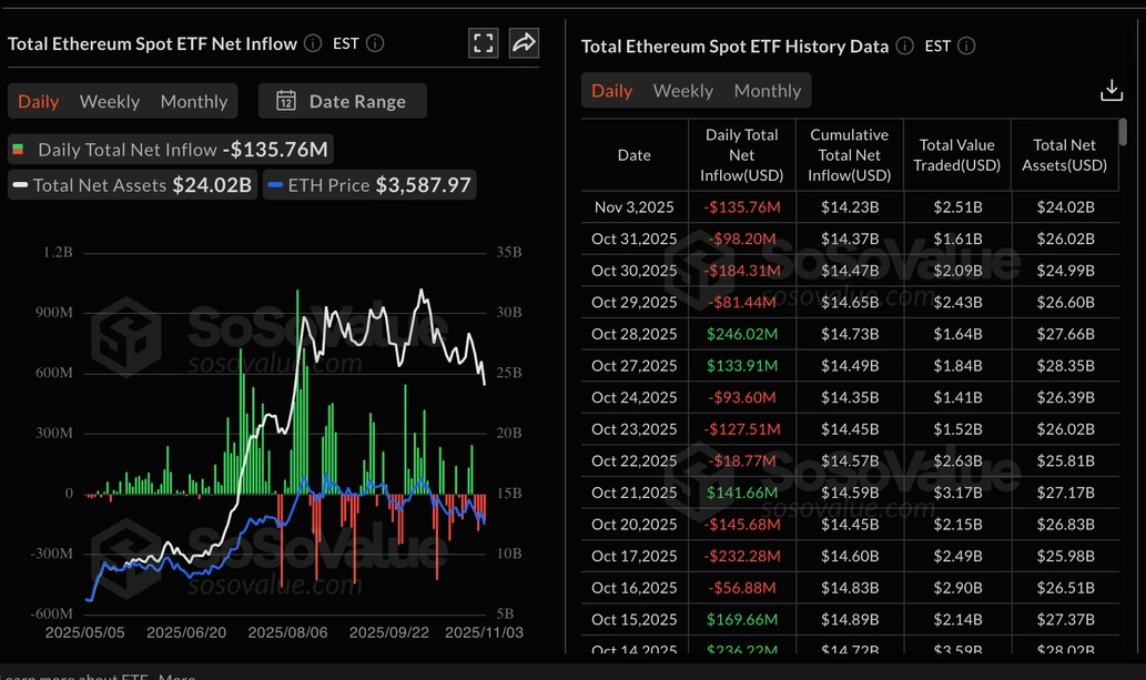 Ethereum cũng đang phải đối mặt với làn sóng rút vốn của các nhà đầu tư tổ chức, với các quỹ ETF niêm yết tại Mỹ ghi nhận dòng vốn rút ròng 136 triệu đô la vào thứ Hai. Không có quỹ ETF ETH nào trong số chín quỹ ETF ghi nhận dòng vốn ròng chảy vào, với ETHA của BlackRock dẫn đầu với mức giảm 82 triệu đô la, tiếp theo là FETH của Fidelity với mức giảm 25 triệu đô la. Cho đến nay, các quỹ ETF Ethereum đã ghi nhận dòng vốn ròng tích lũy là 14,23 tỷ đô la và tài sản ròng khoảng 24 tỷ đô la.