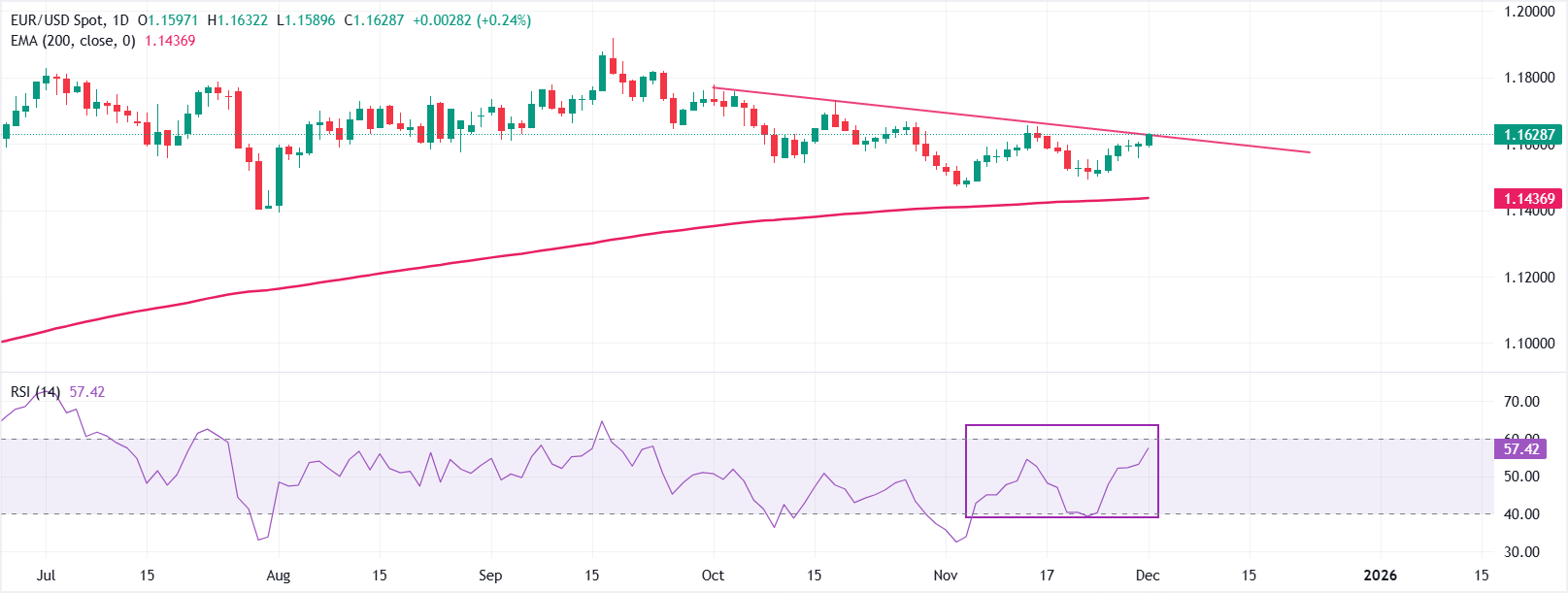 Trên biểu đồ hàng ngày, cặp EUR/USD giao dịch ở mức 1,1629 trong phiên giao dịch châu Âu. Cặp tiền tệ chính này đang giữ trên đường Trung bình động hàm mũ (EMA) 200 ngày đang tăng ở mức 1,1437, cho thấy xu hướng tích cực. Đường EMA 200 ngày đang tăng nhẹ, hỗ trợ xu hướng tăng mới nổi.