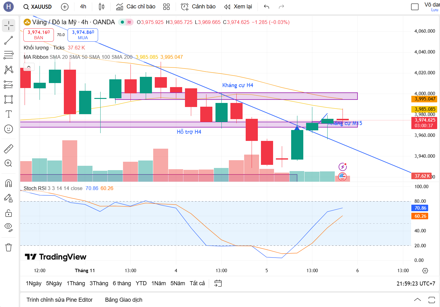Ở khung giá H4, chỉ số giá vàng/ đồng Đô la Mỹ vào lúc 10:00 đã có một nhịp tăng với 3 cây nến xanh, phá vỡ đường xu hướng khung D và nhiều khả năng biến vùng kháng cự H4 cũ thành vùng hỗ trợ mới. Nếu xác nhận xu hướng thành công, giá vàng sẽ tiếp tục "công phá vùng khác cự mới ở mức 3992-4000.