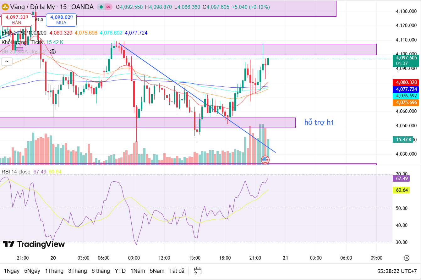 Biểu đồ đang cho thấy một tín hiệu đảo chiều tăng giá mạnh mẽ trong ngắn hạn khi giá đã phá vỡ đường xu hướng giảm và bật tăng dứt khoát từ vùng hỗ trợ H1 (quanh khu vực 4.050). Hiện tại, giá đang giao dịch quanh mức 4.097 và nằm hoàn toàn trên dải các đường trung bình động, đồng thời xuất hiện các nến xanh với thân nến dài kèm khối lượng giao dịch tăng, cho thấy phe mua đang kiểm soát hoàn toàn tình hình. Chỉ báo RSI đang hướng lên mức 67.49, thể hiện động lượng tăng vẫn còn mạnh nhưng đang tiệm cận vùng quá mua, điều này gợi ý rằng giá có khả năng sẽ tiếp tục hướng tới kiểm định vùng kháng cự phía trên (khoảng 4.100 - 4.110) trước khi có thể xuất hiện các nhịp rung lắc hoặc điều chỉnh kỹ thuật.
