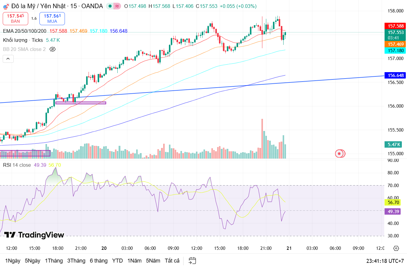 Khung M15 đang cho thấy USD/JPY đang trong nhịp điều chỉnh giảm ngắn hạn sau khi không thể phá vỡ dứt khoát vùng đỉnh tâm lý 158.00. Hiện tại, giá đã cắt xuống dưới đường EMA 20 và đang kiểm định vùng hỗ trợ động tại đường EMA 50. Chỉ báo RSI đã giảm từ vùng quá mua xuống mức 49.39 và cắt xuống dưới đường tín hiệu vàng, cho thấy động lượng tăng đã suy yếu đáng kể và phe bán đang chiếm ưu thế trong ngắn hạn. Hiện tại, các mốc hỗ trợ động EMA 100 và 200 sẽ đóng vai trò quan trọng trong việc quyết định xu hướng mới.