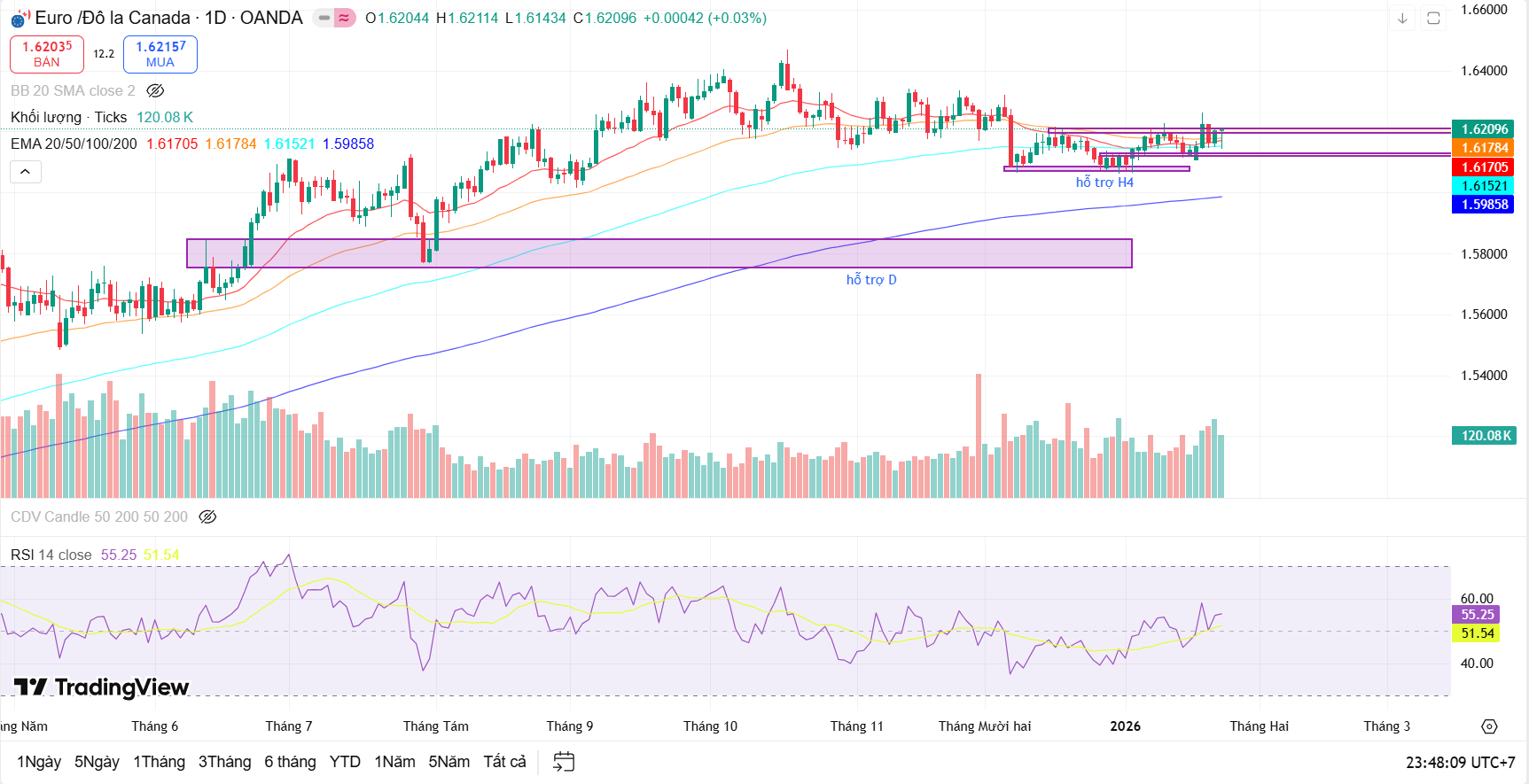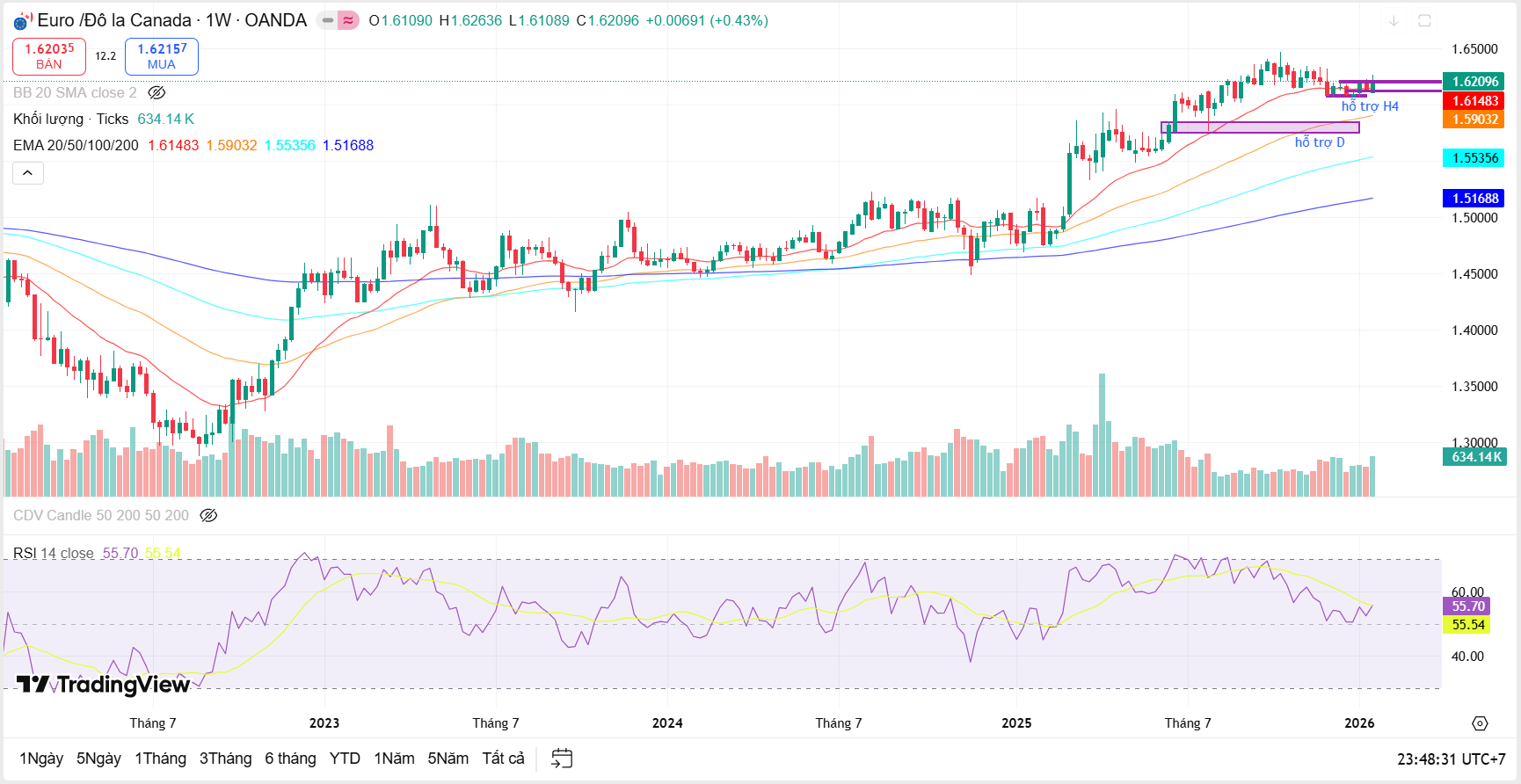Ở khung tuần, sau pha tăng mạnh đưa giá lên vùng đỉnh mới, EUR/CAD bắt đầu bước vào giai đoạn điều chỉnh – tích lũy. Giá hiện dao động quanh EMA 20 tuần, cho thấy đây là vùng cân bằng quan trọng giữa bên mua và bên bán. RSI tuần hạ nhiệt về quanh 55–56, phản ánh sự suy giảm động lượng tăng ngắn hạn nhưng chưa xuất hiện tín hiệu suy yếu rõ ràng. Cấu trúc xu hướng trên khung tuần vẫn được giữ vững khi các đáy cao dần chưa bị phá vỡ.