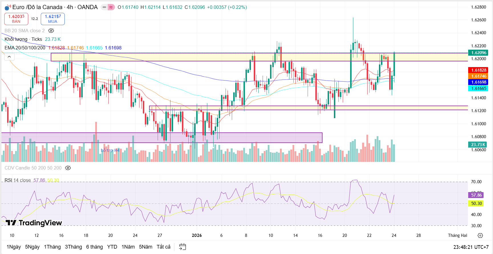 Xét tổng thể, cấu trúc giá của EUR/CAD vẫn nằm trong khuôn khổ xu hướng tăng từ trung hạn đến dài hạn. Các nhịp điều chỉnh gần đây chưa phá vỡ các đáy quan trọng, cho thấy bên mua vẫn kiểm soát cấu trúc chính. Động lượng tăng đã suy giảm so với giai đoạn bứt phá trước đó, nhưng chưa chuyển sang trạng thái tiêu cực. Hệ thống EMA trên các khung lớn tiếp tục đóng vai trò nâng đỡ cho giá, trong khi RSI ở đa số khung thời gian duy trì trên vùng trung tính, củng cố quan điểm rằng thị trường đang tích lũy trong xu hướng tăng thay vì đảo chiều.