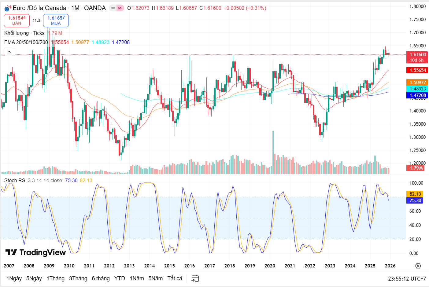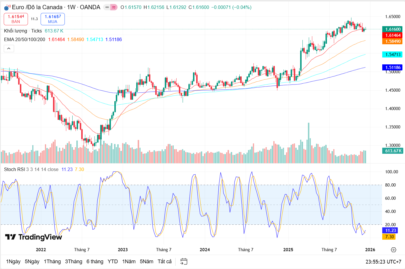 Trên khung tháng, EUR/CAD tiếp tục duy trì cấu trúc tăng trung – dài hạn. Giá vẫn nằm vững phía trên cụm EMA quan trọng (EMA50–100–200), cho thấy xu hướng chính chưa bị phá vỡ. Tuy nhiên, nến tháng hiện tại có dấu hiệu chậm lại về đà tăng, phản ánh tâm lý thận trọng khi giá đã tiệm cận vùng kháng cự cao trong nhiều năm. Chỉ báo Stochastic RSI trên khung này đang ở vùng cao, hàm ý rủi ro điều chỉnh kỹ thuật vẫn còn tồn tại.