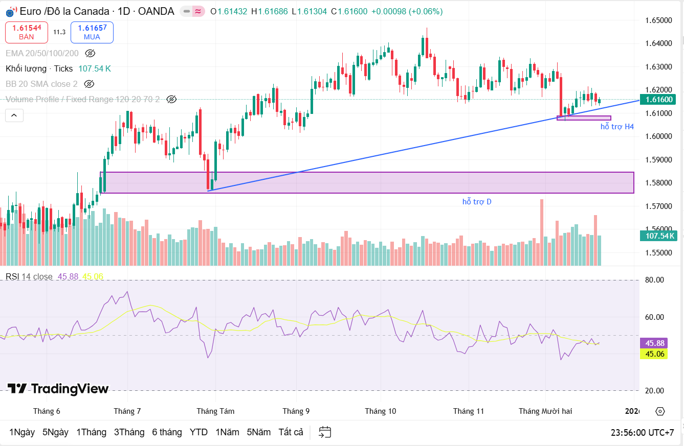 Trên khung ngày, giá vận động chủ yếu trong biên độ hẹp, dao động quanh khu vực 1.6100–1.6200. Cấu trúc tăng vẫn được bảo toàn khi đáy sau không phá đáy trước, đồng thời đường trendline tăng dài hạn vẫn đang nâng đỡ giá khá tốt.