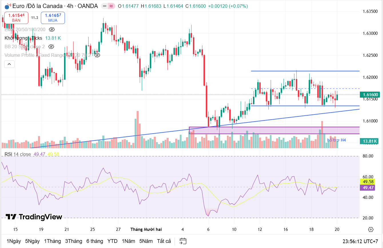 Ở khung H4, EUR/CAD thể hiện rõ trạng thái sideway tích lũy. Giá liên tục phản ứng tại vùng hỗ trợ H4 quanh trendline tăng và vùng kháng cự ngắn hạn phía trên.