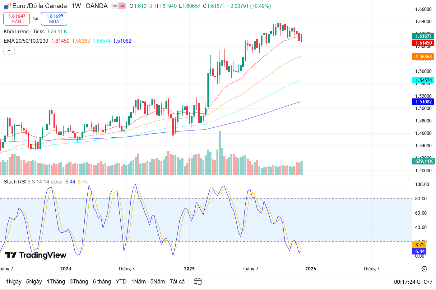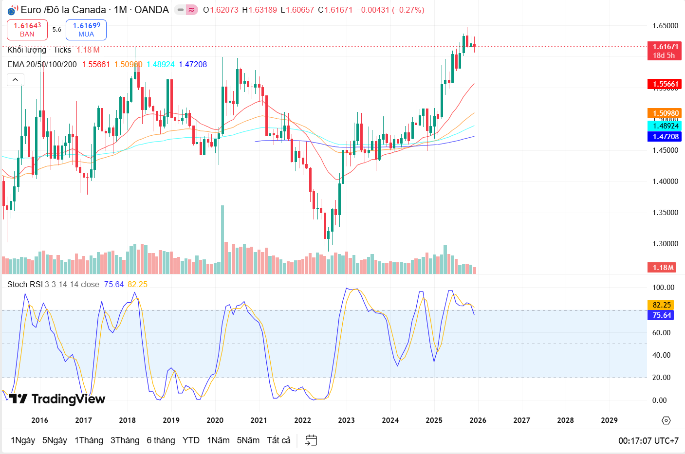 Trên khung tháng, EUR/CAD vẫn duy trì xu hướng tăng dài hạn rất rõ ràng. Giá tiếp tục nằm cao hơn toàn bộ các đường EMA 50, 100 và 200, cho thấy lực mua dài hạn vẫn chiếm ưu thế. Tuy nhiên, trong tháng hiện tại, đà tăng có dấu hiệu chậm lại khi xuất hiện các nến thân nhỏ, phản ánh sự giằng co giữa bên mua và bên bán tại vùng giá cao.