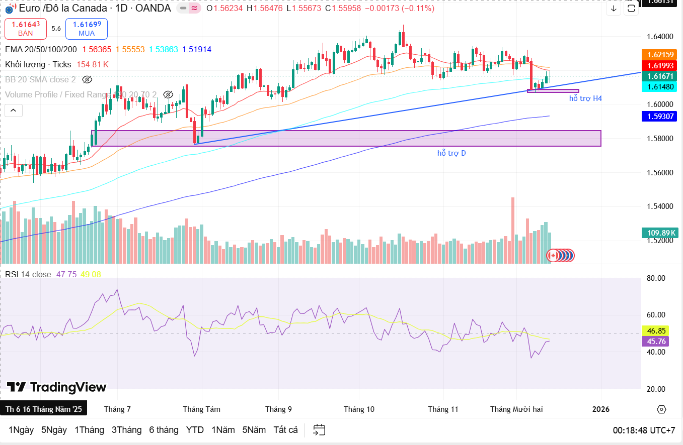 Trên khung ngày, tuần qua chứng kiến một pha điều chỉnh rõ ràng. Giá giảm về kiểm định vùng hỗ trợ ngày quanh 1.60 – 1.595, trùng với khu vực EMA 100–200 ngày và đường xu hướng tăng dài hạn.