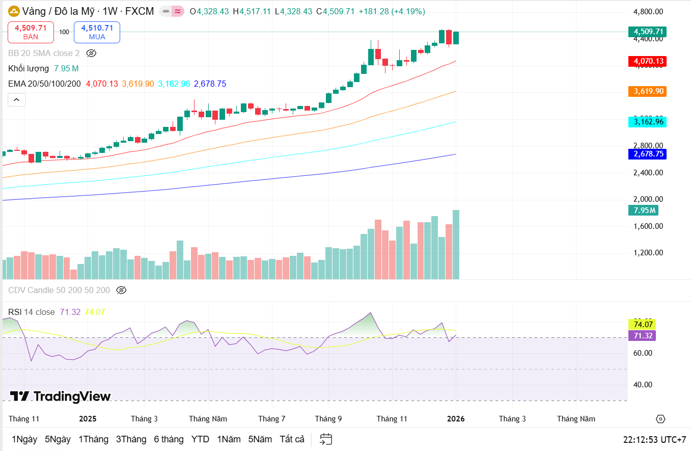 Ở khung tháng, bức tranh dài hạn vẫn cực kỳ tích cực. Vàng đang vận động trong xu hướng tăng rất mạnh và rõ ràng, với khoảng cách ngày càng lớn so với các đường EMA dài hạn. Khối lượng giao dịch duy trì ở mức cao trong nhiều tháng liên tiếp, cho thấy dòng tiền lớn vẫn đang hiện diện trong thị trường. Tuy nhiên, việc RSI tháng đã tiến sâu vào vùng quá mua cũng hàm ý rằng trong các tuần tới, thị trường hoàn toàn có thể xuất hiện những nhịp điều chỉnh kỹ thuật sâu hơn để cân bằng lại cung – cầu, trước khi xác lập các mốc cao mới.
