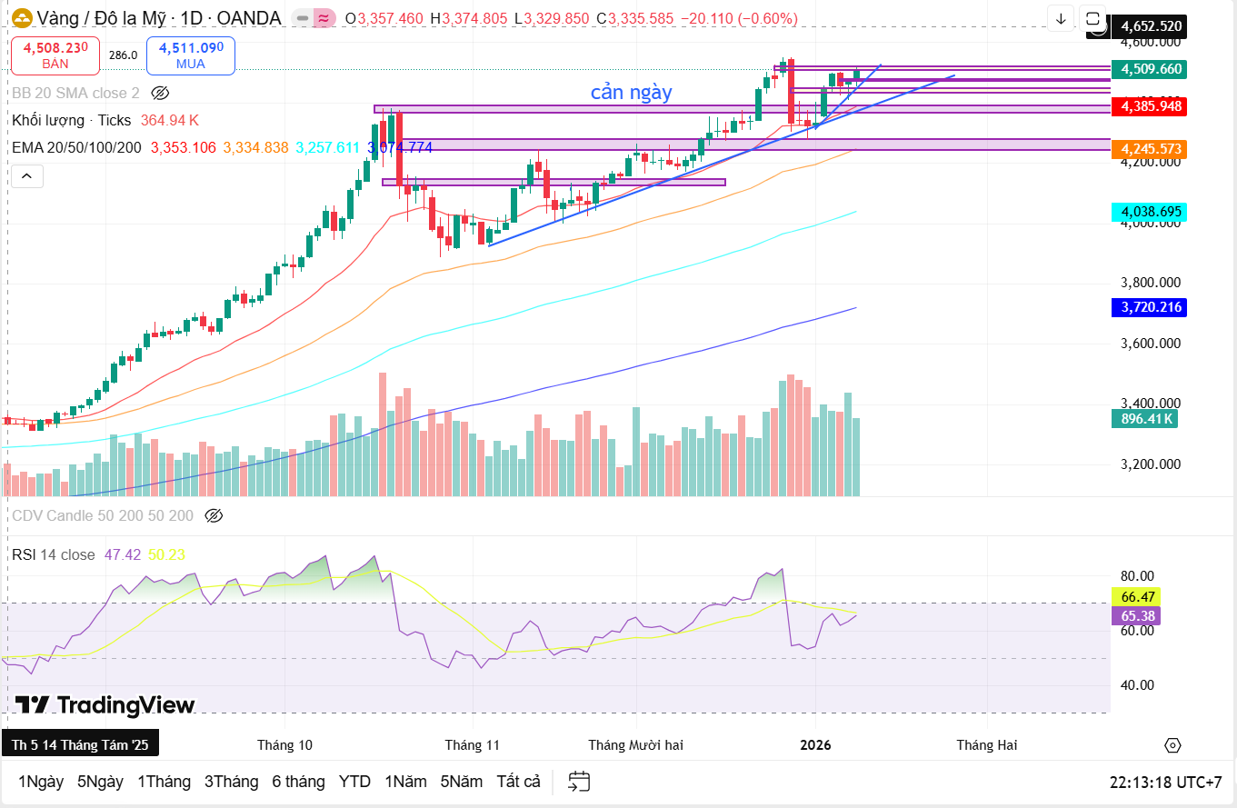 Ở khung ngày, vận động giá nổi bật với việc vàng liên tục kiểm tra và phản ứng quanh các vùng cản quan trọng. Các phiên đầu tuần ghi nhận lực mua duy trì tốt, giúp giá bật lên nhanh mỗi khi điều chỉnh. Tuy nhiên, về cuối tuần, áp lực chốt lời ngắn hạn xuất hiện rõ hơn, khiến giá hình thành các cây nến thân nhỏ, rút râu dài, phản ánh sự thận trọng của dòng tiền khi giá đã ở vùng rất cao. Dù vậy, cấu trúc tăng trên D1 vẫn chưa bị phá vỡ khi các đáy sau vẫn cao hơn đáy trước và giá tiếp tục nằm trên hệ thống EMA chủ đạo.
