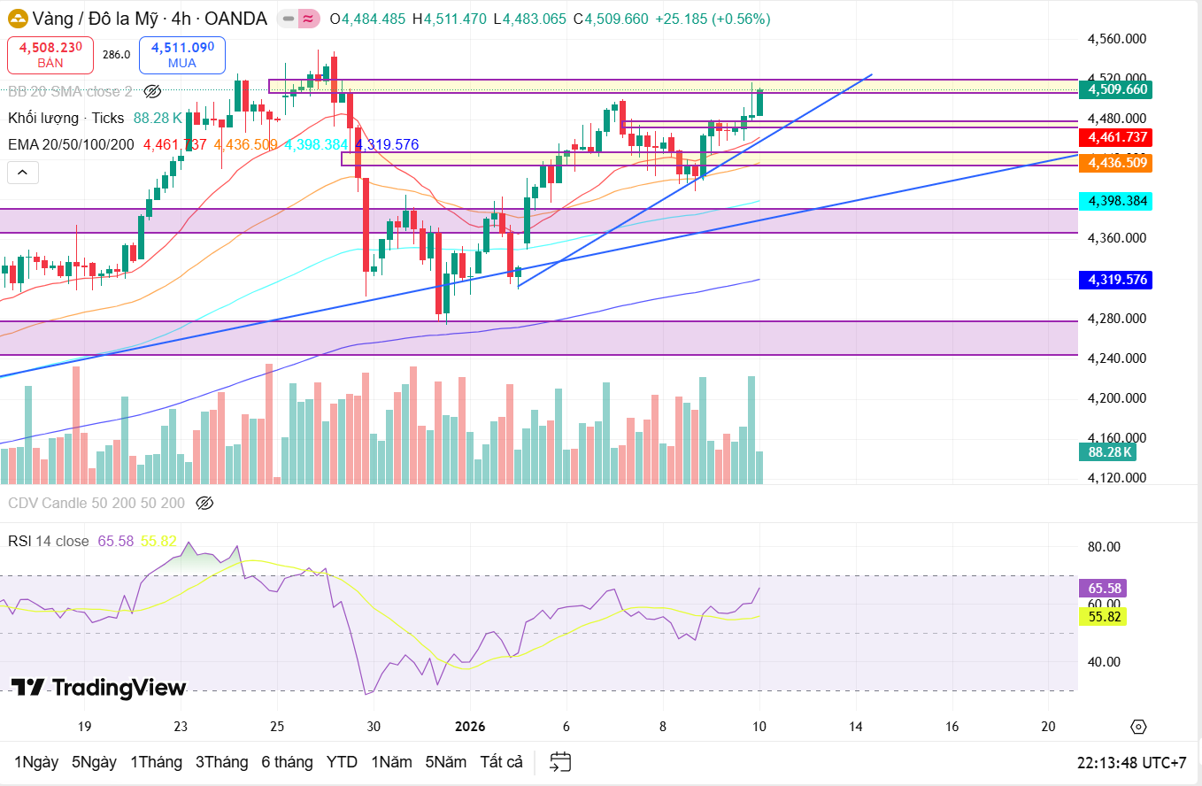 Quan sát khung H4, thị trường thể hiện rõ trạng thái tăng – tích lũy – tiếp diễn. Sau nhịp điều chỉnh mạnh trước đó, vàng đã hồi phục và di chuyển trong kênh tăng ngắn hạn, liên tục bật lên từ các vùng hỗ trợ hợp lưu giữa trendline tăng và EMA50–EMA100. Việc giá quay trở lại test vùng đỉnh cũ trong tuần cho thấy phe mua vẫn kiểm soát xu hướng, song động lượng tăng không còn quá dốc, thay vào đó là các nhịp tăng – nghỉ đan xen nhằm hấp thụ lực chốt lời.