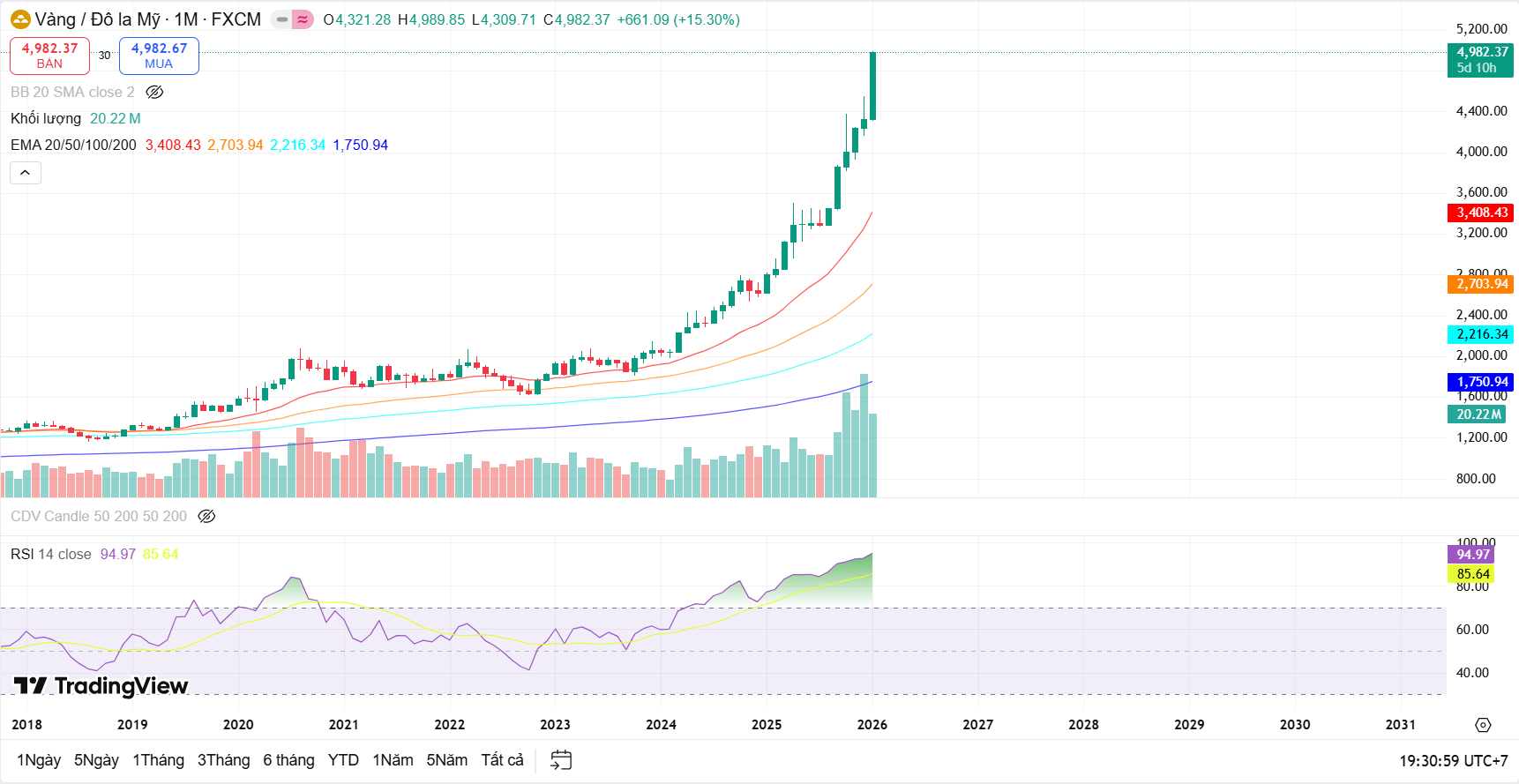 Trên khung thời gian tháng, cấu trúc tăng dài hạn của vàng vẫn được duy trì một cách rõ ràng và chưa có dấu hiệu suy yếu. Giá tiếp tục vận động phía trên toàn bộ hệ thống EMA dài hạn, với độ dốc các đường trung bình ngày càng mở rộng, cho thấy xu hướng tăng lớn vẫn đang được củng cố bởi dòng tiền dài hạn.