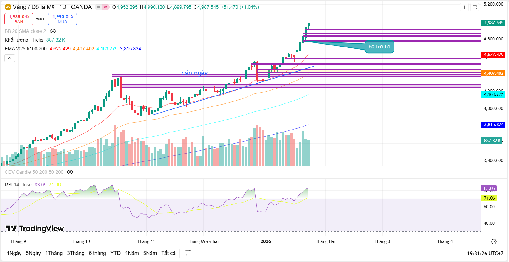 Trên khung ngày, cấu trúc tăng của vàng vẫn được bảo toàn khi các đáy sau tiếp tục cao hơn đáy trước và giá duy trì phía trên toàn bộ hệ thống EMA chủ đạo. Xu hướng tăng ngắn – trung hạn vì vậy chưa có dấu hiệu bị phá vỡ.