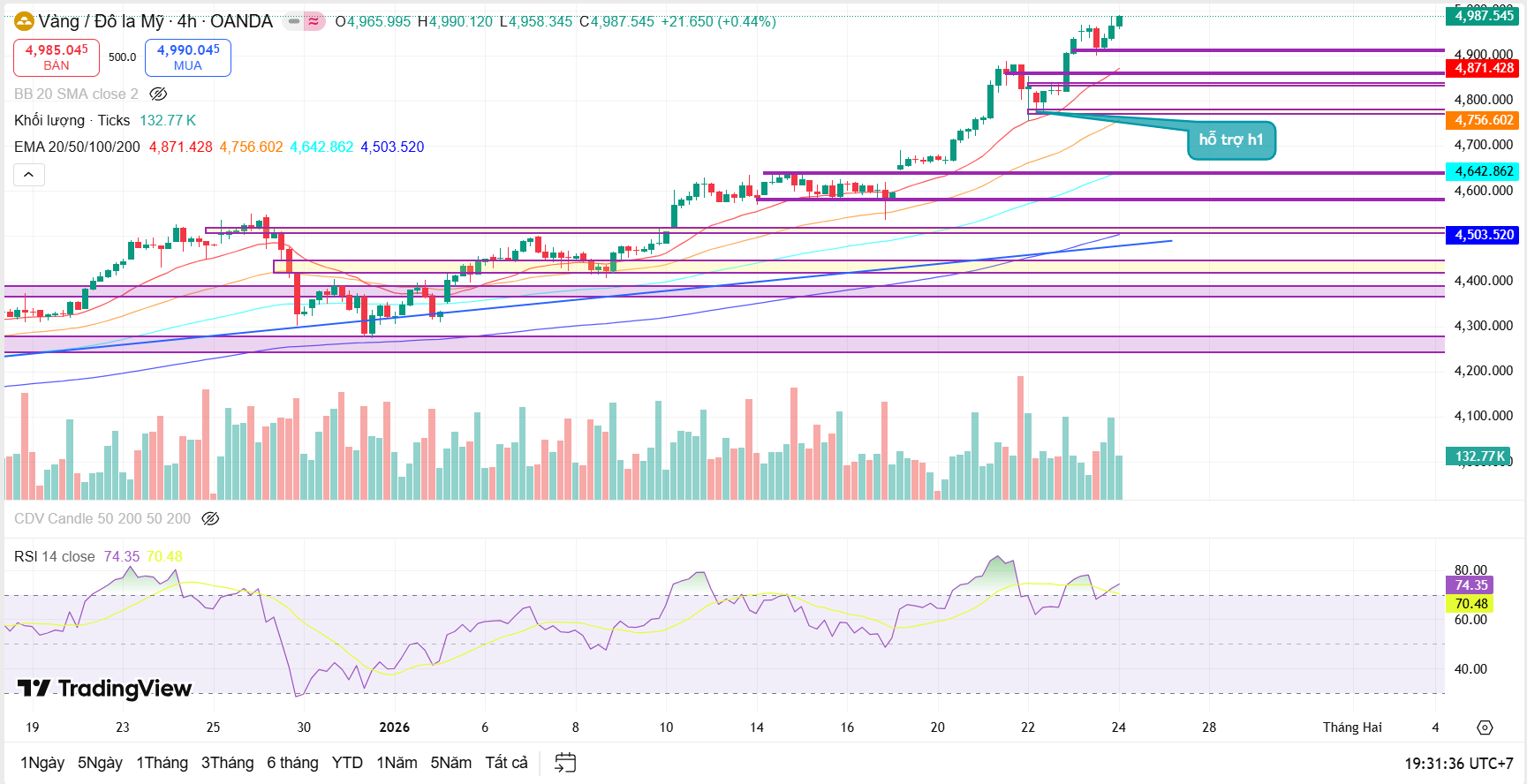 Quan sát trên khung H4, sau nhịp tăng mạnh, giá bắt đầu có xu hướng vận động chậm lại và hình thành các pha tích lũy ngắn hạn trên cao. Các nhịp điều chỉnh nhỏ đều được hấp thụ quanh các vùng hỗ trợ hợp lưu giữa EMA20, EMA50 và EMA100, cho thấy phe mua vẫn đang kiểm soát cấu trúc tổng thể.