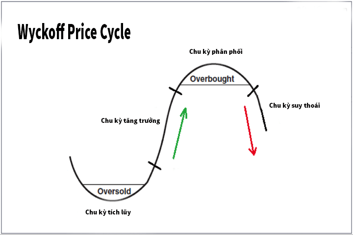 Ngoài ra, phương pháp này cũng chỉ ra rằng thị trường tuần hoàn theo 4 chu kỳ tích lũy – tăng trưởng – phân phối và suy thoái. Dựa vào 3 quy luật và 4 chu kỳ của phương pháp Wyckoff, các nhà giao dịch có thể lựa chọn được cổ phiếu tiềm năng, cũng như xác định thời điểm thích hợp để thực hiện giao dịch.