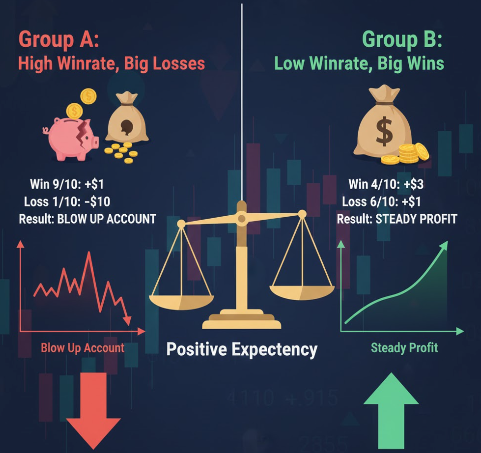 Trong thị trường tài chính, phần lớn người mới thường lao vào tìm “tỷ lệ thắng càng cao càng tốt”. Họ nghĩ rằng: