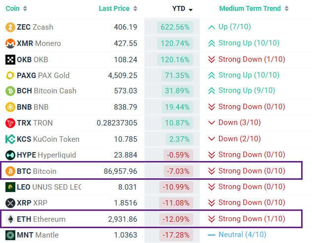 Sau khi tăng mạnh lần lượt 34% và 43% ở mức đỉnh, BTC và ETH đã mất hết lợi nhuận và hiện đang giảm -7% và -12%. Trong khi đó, các đồng tiền điện tử bảo mật như Zcash (ZEC) và Monero (XMR), cùng các đồng tiền giao dịch (BNB, OKB, KCS, HYPE) lại hoạt động tốt hơn.