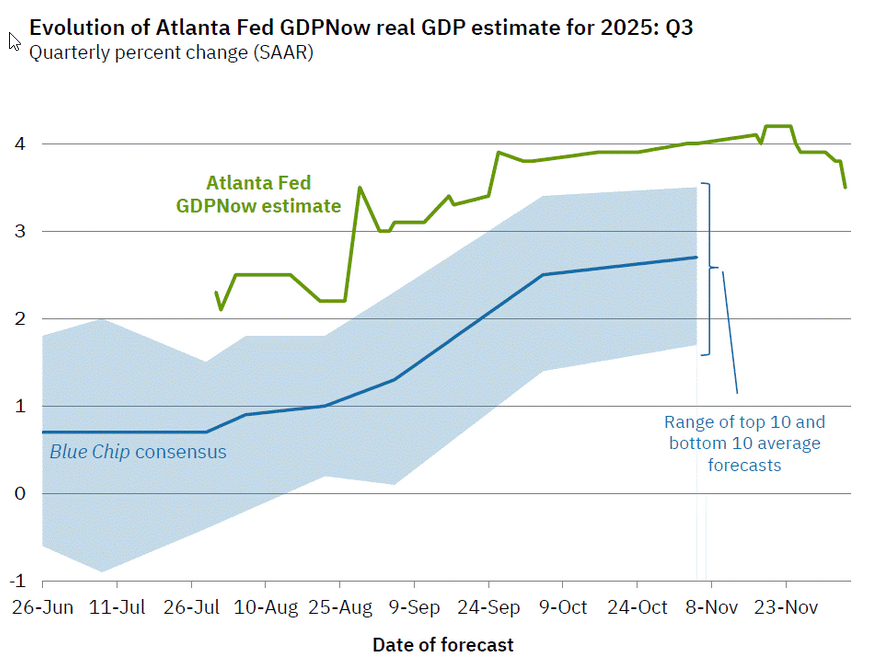 Tin vắn : Fed chính có xem xét GDPNow của Fed Atlanta không? Nhiều Fed khu vực đã đưa ra dự báo, trong đó Fed Atlanta và Cleveland có lẽ là những đơn vị dẫn đầu. Tuần trước, Fed Atlanta đã công bố GDPNow quý 3, cho thấy mức giảm từ 3,8% vào ngày 4 tháng 12 xuống 3,5% vào ngày 5 tháng 12 do tăng trưởng tiêu dùng cá nhân giảm từ 3,1% xuống 2,7%. Chúng ta sẽ nhận được một báo cáo khác "không muộn hơn thứ Năm, ngày 11 tháng 12" và mô hình đầu tiên cho quý 4 không sớm hơn ngày 23 tháng 12.
