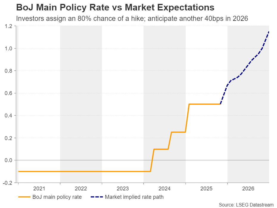 Cuối cùng nhưng không kém phần quan trọng, Ngân hàng Nhật Bản (BoJ) hiện được cho là sẽ tăng lãi suất với xác suất 75%. Đối với năm tới, các nhà đầu tư dự đoán sẽ có thêm 40 điểm cơ bản nữa được tăng lãi suất, tương đương với mức giảm 0,25 điểm phần trăm và xác suất giảm lần thứ ba là 60%.