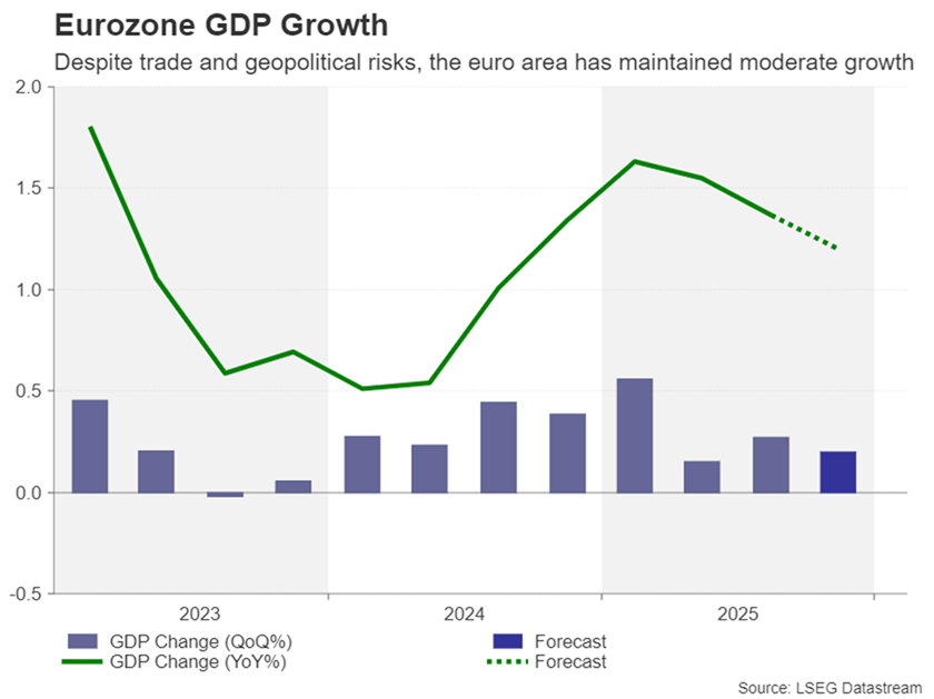 Một trong những rủi ro đó là sự leo thang căng thẳng thương mại giữa EU và Mỹ có thể làm tăng khả năng Ngân hàng Trung ương châu Âu (ECB) cắt giảm lãi suất một lần nữa trong năm nay. Tuy nhiên, hiện tại, các dữ liệu dự kiến sẽ tiếp tục hỗ trợ lập trường trung lập của ECB .