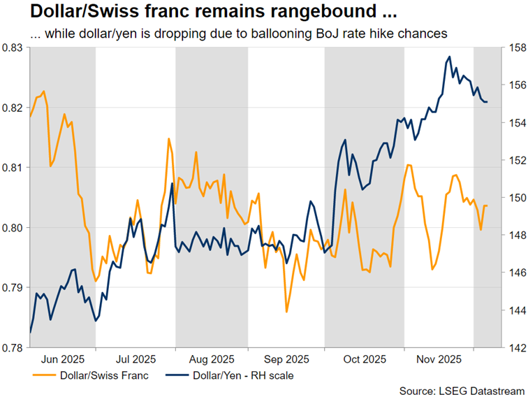 Chủ tịch SNB Schleger gần đây đã nhắc lại ngưỡng cao cho lãi suất âm , hy vọng rằng dự báo của SNB về việc lạm phát tăng tốc vào năm 2026 sẽ được xác nhận. Đáng chú ý, thị trường đã không hề thờ ơ với những phát biểu về lãi suất âm, với đồng franc Thụy Sĩ gần đây đã ổn định so với cả đồng euro và đồng đô la. Trước khi có một xu hướng ôn hòa vào thứ Năm, phản ứng ngắn hạn của đồng franc sẽ chủ yếu phụ thuộc vào diễn biến của đồng đô la. Điều thú vị là sự hội tụ của các đường trung bình động đơn giản của đồng đô la/franc đang cho thấy sự gia tăng biến động trong tương lai.