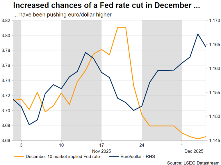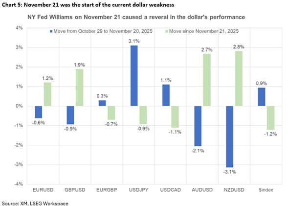 Mặc dù bất kỳ sự điều chỉnh nào trên biểu đồ điểm có thể dễ dàng được biện minh, nhưng Chủ tịch Powell sẽ phải giải thích nghiêm túc nếu việc cắt giảm lãi suất thực sự được công bố, sau khi đã tuyên bố trong cuộc họp báo hồi tháng 10 rằng người ta nên lái xe chậm lại khi trời mù sương. Việc sử dụng lập luận "thị trường lao động yếu hơn" có thể sẽ bị coi là một lời biện minh hời hợt, một lần nữa làm tổn hại đến uy tín vốn đã thấp của Fed.
