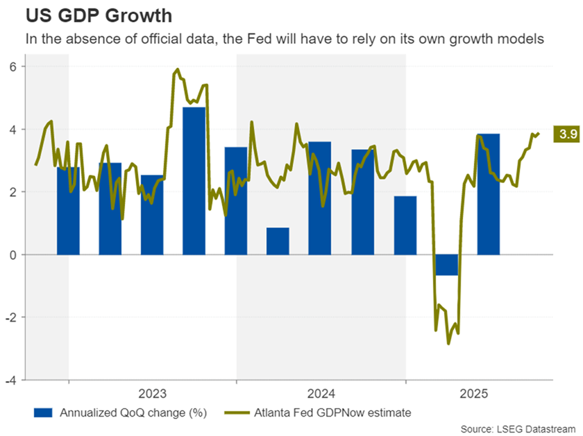 Với việc chính phủ tiếp tục đóng cửa, nhiều thông tin kinh tế khác có vẻ sẽ bị gác lại vào tuần tới, bao gồm đơn đặt hàng hàng hóa lâu bền công bố vào thứ Hai, ước tính GDP sơ bộ cho quý 3 công bố vào thứ Năm và báo cáo thu nhập và chi tiêu cá nhân công bố vào thứ Sáu bao gồm số liệu chi tiêu của người tiêu dùng và chỉ số giá PCE cốt lõi.